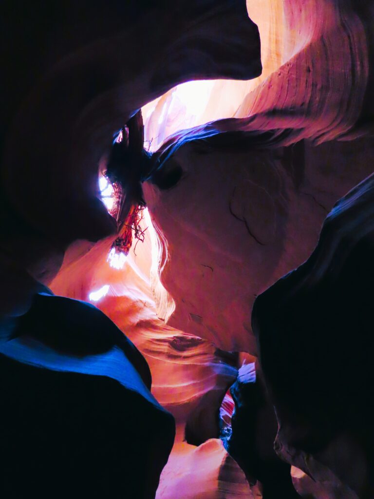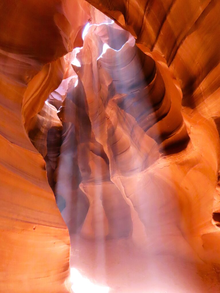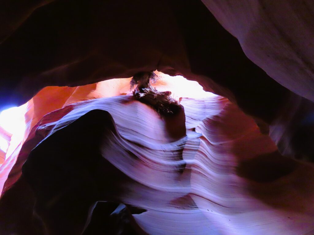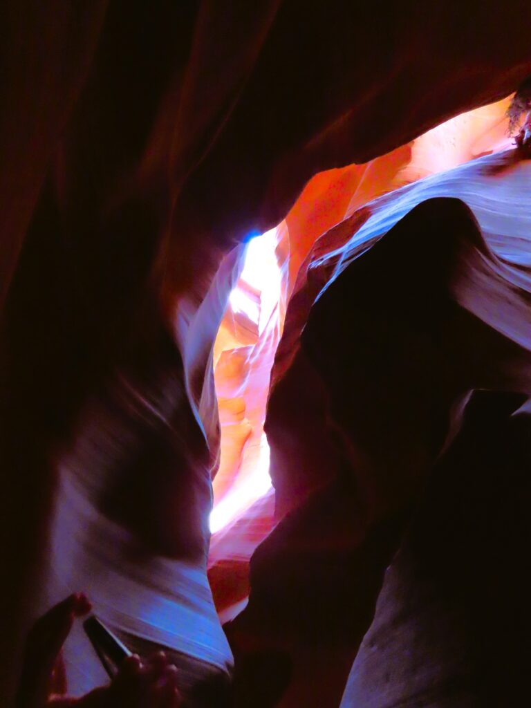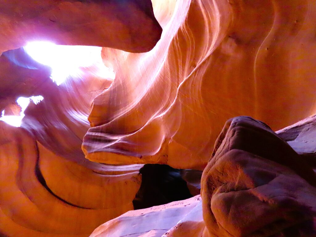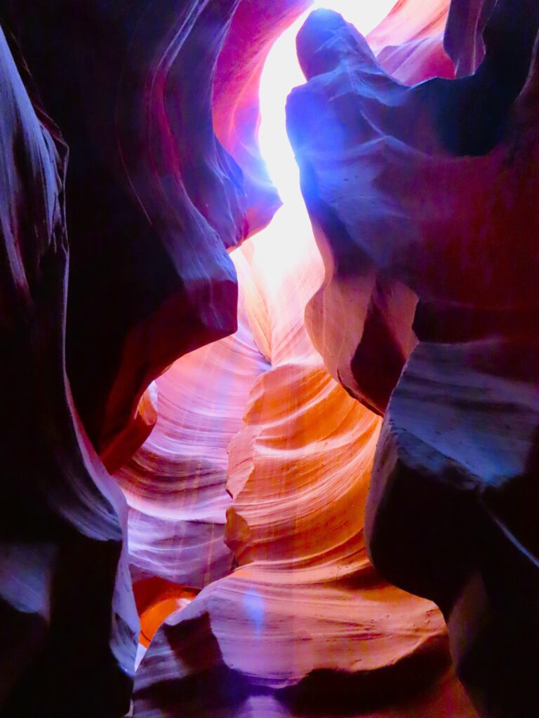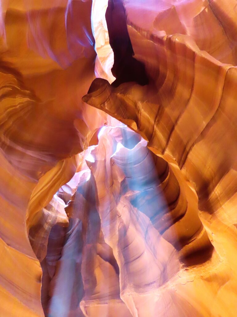 Last week, I shared my beguiling iPhone photos of Antelope Canyon in Page, Arizona. My iPhone pics might be even better than my camera ones. The swirling shapes, textures, and light from last week are truly surreal and hard to beat. But my camera highlighted more colors that I was able to finesse. I aimed high, as many humans were littering the narrow slot canyon. The winding, sandy path was short, and above our heads, driftwood and debris sat lodged from the water that created this natural masterpiece. Shafts of light hovered like ethereal angel wings. Follow my feet…